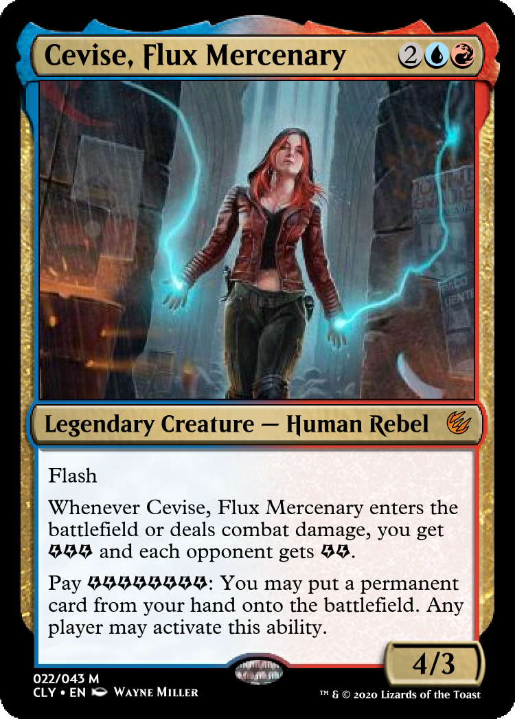 Cevise was a thought experiment on how energy might be utilized in a 4-player format, where players were extremely unlikely to be running support for the mechanic. This is no surprise, given that energy only shows up in about 70 cards from the Kaladesh block. Aside from proliferate, it's difficult to make energy matter to all players at the table. Originally, Cevise wanted to convert attacks into energy to spend on an energy sink payoff in the form of damage to opponents. Looking through the options for this style of deck, the gameplay appeared to be unnecessarily linear, and I instead opted for a design that provided energy to all players involved, thus including the opponents into the energy counter minigame. Flash is a flavor choice that harkens to her affinity to energy. Although a deck built around Cevise will no doubt be focused on exploiting energy and the proliferation thereof, this to be a very fair and fun card to play and play against. She breaks parity on her own, and that seems to be acceptable, considering the low amount of external support. I expect Gonti's Aether Heart and Aetherworks Marvel to be solid mainstays in this deck. Perhaps we might even see some decks lean into blinking some of the ETB creatures for energy.
