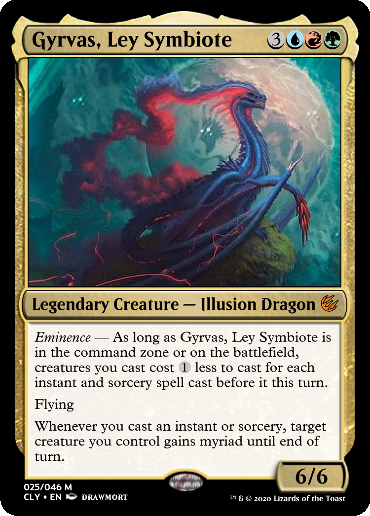 Albeit I do not like eminence as a mechanic, Gyrvas was the product of a personal challenge to utilize different mechanics to trailblaze new designs under rougher constraints. I opted to use eminence to create a myriad commander with a unique cost reduction mechanic. The most interesting part of this card is the deckbuilding restriction it creates. Generally speaking, Temur (GUR colors) has an affinity for creatures and their wild savagery, but this card incentivizes leaning into the spellflinging Izzet (UR) side of the card that cares about instants and sorceries, thus rewarding the casting of smaller, stormy spells into creature payoffs. Of concern, eminence is a difficult mechanic to balance around. Storm builds that can exploit this ability are a focal point for scrutiny, but Storm 13 to windmill slam Emrakul, the Promised End feels acceptable and is fair game, considering the required setup. Ultimately, I intend for Gyrvas to encourage combining cheap storm or cascade spells with a heavy creature base that plays with myriad, and I expect some overlap with Maelstrom Wanderer decks. Stacking multiple instances of myriad to attack with should be a solid win condition.