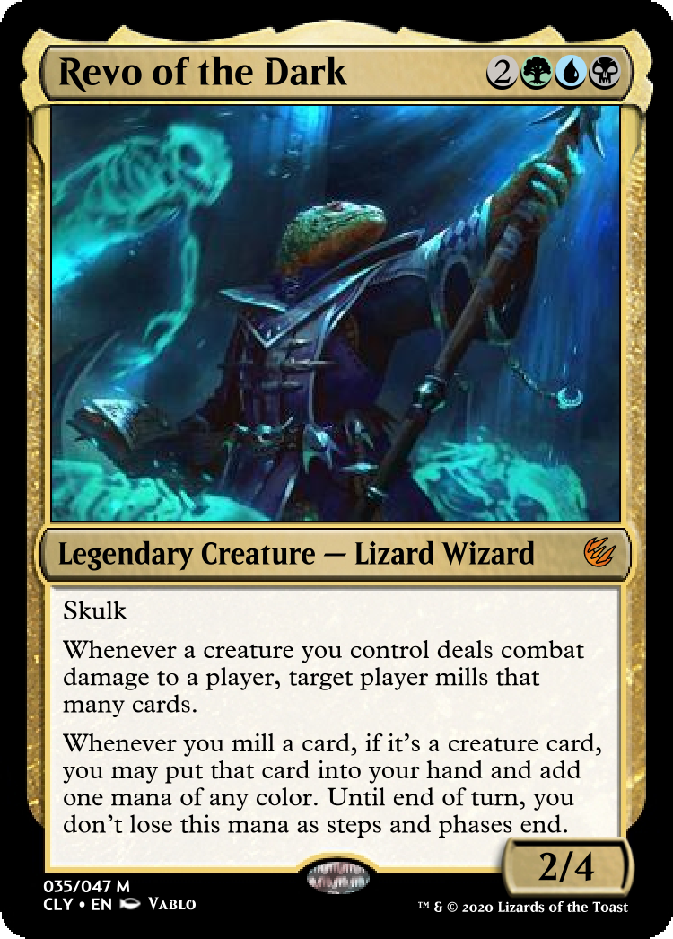 Sultai (BGU) has a long history of being especially value-oriented graveyard recursion heavy decks. Revo is an alternate take on Sultai; Revo motivates a more combat-oriented mill strategy that still plays nice with standard graveyard-centric playstyles. Combat focus is something we generally see with Dimir (UB) cards, but adding green to facilitate a creature-combat gameplay loop. Revo comes with evasion to connect with opponents, consistently milling cards. The twist here is that two avenues of gameplay are unlocked - milling yourself versus milling opponents. Access to enablers such as Fleet Swallower and Traumatize will allow both strategies to be viable, providing huge targets to reanimate or cast with Sultai's toolset and the mana to get there. Revo decks will likely share similarities to some Phenax, God of Deception decks. Along with dredge, the influx of rogue support in 2020 offers Revo more success with this gameplan. The mill-to-draw/mana conversion on this card can potentially be too powerful or warping, and that would likely be the first area to target for changes in that event. Self-mill strategies will appreciate winning with a Thassa's Oracle effect.